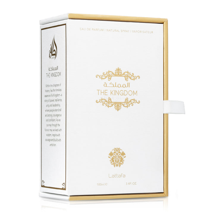 The Kingdom Men by Lattafa is a sophisticated men’s fragrance featuring citrusy top notes, a herbal and spicy heart, and a woody aromatic base with oud and amber. Perfect for formal and evening wear.